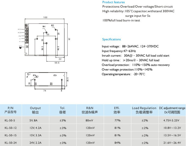 高可靠性:105C長(zhǎng)壽命電容,能承受300VAC輸入電壓5秒不損壞